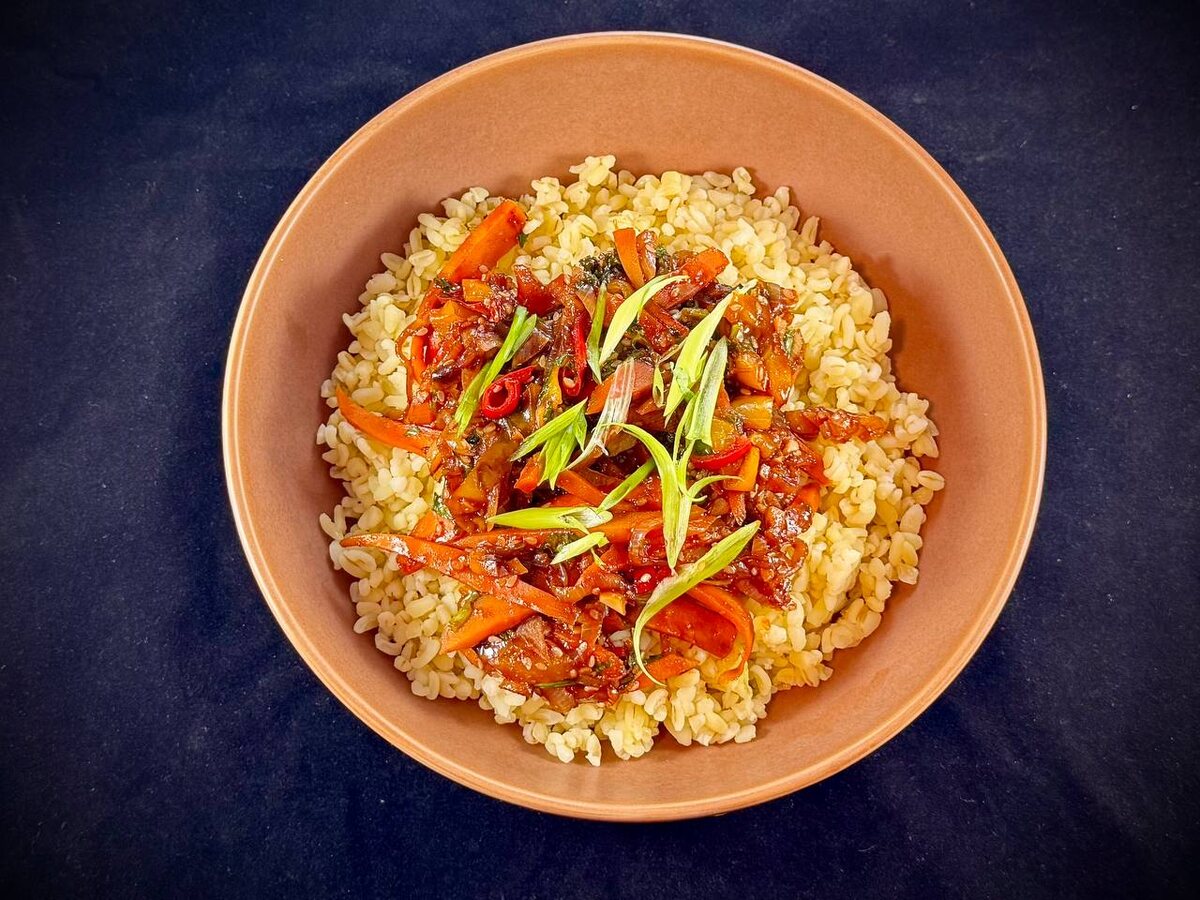 Булгур с овощной заправкой в азиатском стиле. Суть не в Булгуре. Суть в заправке. Она получается пряной за счёт имбиря и слегка острой. Но давайте по порядку. Ингредиенты: 1️⃣ Булгур (можно заменить любой крупой) 2️⃣ Перец болгарский - 2 шт 3️⃣ Перец Чили - 2 шт (ориентируйтесь на остроту, у меня был слабоострый) 4️⃣ Лук репчатый - 2 средних луковицы 5️⃣ Морковь - 2 шт средних 6️⃣ Сок 1/2 лимона 7️⃣ Зелень - пучок 8️⃣ Чеснок - 2 зубчика 9️⃣ Соевый соус - 3-4 ст.л или паста Хойсин - 2 ст.л 🔟 Растительное масло для обжарки - 30 мл 1️⃣1️⃣ Кунжут - 2-3 ст.л Сухие специи: Соль Имбирь - 1 ст.л Копчёная паприка - 1 ст.л Приготовление: 1. Ставим варить крупу 2. Перец режем полосками и обжариваем на растительном масле, на сковороде. 3. Лук режем четверть-кольцами и отправляем к перцам. Перемешиваем. 4. Морковь режем соломкой и добавляем к луку и перцам. 5. Следом идут соевый соус или паста хрйсин, лимонный сок и сухие специи. Всё перемешивается и обжаривается 5 минут 6. Добавляем измельчённ