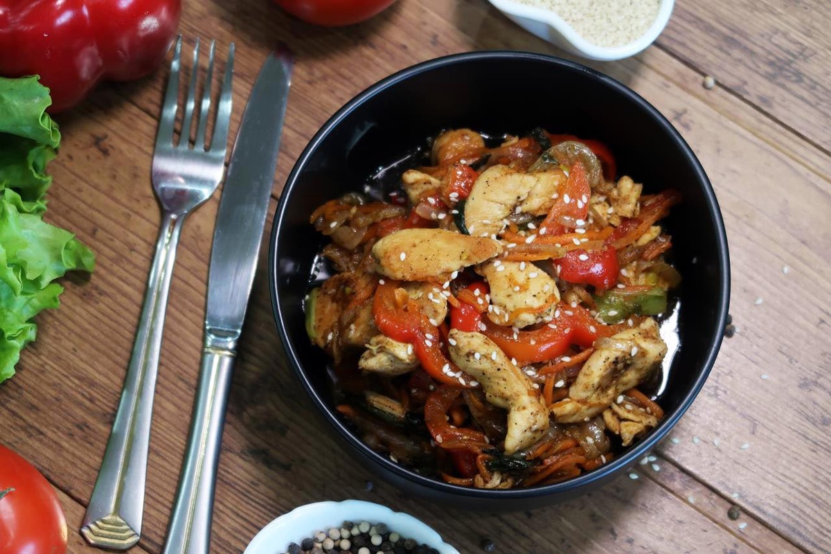 Сегодня мы будем готовить курицу по-азиатски. Чтобы побаловать себя и своих близких азиатскими блюдами, совсем не обязательно идти в ресторан. Курица по этому рецепту в домашних условиях получается очень вкусной и ароматной, ведь мы будем готовить её с любовью и хорошим настроением. Только из свежих и качественных продуктов. Все ингредиенты очень хорошо сочетаются друг с другом. В процессе приготовления куриное филе с овощами приобретает пикантный насыщенный вкус, который отлично балансирует с отварным рисом. А сейчас давайте перейдем к рецепту и посмотрим, как приготовить курицу по-азиатски. Видео приготовления: https://vkvideo.ru/video-227283412_456239845 Куриное филе нарезаем на кусочки средней величины. Репчатый лук нарезаем полукольцами. Болгарский перец нарезаем брусочками. Морковь измельчаем длиной соломкой. Для этого используем тёрку для приготовления моркови по-корейски. Зелёный лук крупно нарезаем. Чеснок натираем на тёрке с мелким полотном. В отдельной чашке смешиваем со