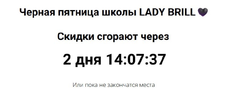 Девочки, уже доступно видео второго дня нашей Чёрной пятницы! Места на программы стремительно заканчиваются, и таких цен больше не будет. Поэтому смотрите сейчас, выбирайте и успевайте забрать своё по максимально выгодной стоимости. Обнимаю и жду вас внутри! 💫 👇👇👇👇👇 https://ladybrill.getcourse.ru/zapis_17.11