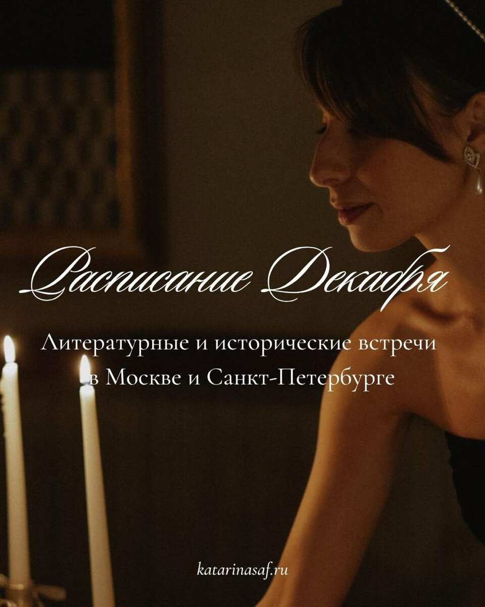 Расписание декабря: Встречи в Москве и Петербурге Дорогие друзья! С волнением и радостью спешу поделиться с вами расписанием долгожданных новогодних встреч в Москве и Петербурге 🎄 Петербург: 💫 12 декабря — роскошный театральный вечер в Петербурге, вдохновленный Галиной Улановой и Майей Плисецкой. Подарите себе праздничную встречу в изысканном петербургском доме ST.CASANIER и почувствуйте себя гостями Царской ложи. Мерцают свечи, звенят бокалы, на сцене блистают лед и пламень русского балета. Новогоднее волшебство начинается! Москва: 💫 21 декабря — праздничный дореволюционный бранч в «Кафе Пушкинъ» по мотивам «Евгения Онегина». Не встреча, а путешествие в XIX век: исторический «Каминный зал», изысканный стол, блюда русско-французской кухни XIX века и обсуждение величайшего романа, его создателя и бальных традиций прошлого — одна из самых любимых ваших тем, что неизменно собирает полный зал! 💫 27 декабря — грандиозно завершим декабрь на Новогоднем вечере в бальном зале XIX век