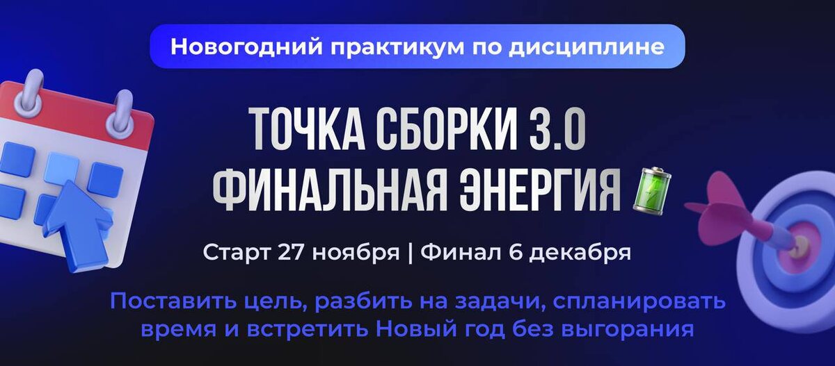 Как вам идея составить план на декабрь, чтобы достичь одну цель до НГ и не выгореть? Объявляю онлайн-практикум по дисципине "ТОЧКА СБОРКИ 3.0. ФИНАЛЬНАЯ ЭНЕРГИЯ" по работе с прокрастинацией, планированием и энергией. 🗓Старт - 27 ноября в 10:00 Мск. Длительность программы - 10 дней. Создатель воркшопа Кирилл Куликов - эксперт по дисциплине, двукратный чемпион Мира и Европы, призер Всемирных игр по спортивной аэробике. [РЕГИСТРАЦИЯ НА ПРАКТИКУМ] Программа практикума: 10 дней - 10 заданий - 3 эфира с разборами ваших ситуаций и ответами на вопросы. День 1 (27.11, чт). Разберем, зачем признавать успехи. День 2 (28.11, пт). Присвоим победы за год без самокритики. День 3 (29.11, сб). Выберем 1 цель, которую завершим до НГ. День 4 (30.11, вс). Выходной. День 5 (1.12, пн). Превратим цель в реалистичный план. День 6 (2.12, вт). Составим «Карту декабрьской загрузки» (покупки, уборка, корпоративы). День 7 (3.12, ср). Совершим первый шаг к цели. День 8 (4.12, чт). Проанализируем первый шаг и