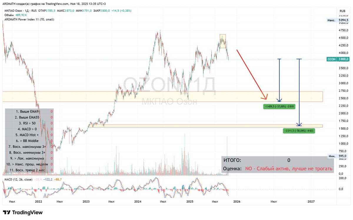 📦 #OZON Озоновая дыра засосет на уровни 2400 / 1600 акционеров. Массовое озонирование может привести к реализации даунсайда на -37% и -58% соответственно. Подождем весны наверное здесь уже. Когда апсайда и триггеров уже нет, все увеселительные мероприятия компания провела, даже дивиденд объявили, а блоггеры поют хором вокруг о "супер-пупер" прибыльном два квартала Озоне - обычно делать в таких случаях уже нечего, игра сделана. Рынок у нас сейчас никак не бычий, а это актив - сверхповышенного риска и волатильности в отсутствии ликвидности и новых денег покупателей. Бежать и бояться. Не забываем про необходимую реализацию огромного "навеса" акций. Под это дело любые басни сейчас о росте и потенциальной дешевизне будут уместны🤡 График едет по знакомым рельсам и повторит судьбу #X5 - ситуация 1 в 1. 🦉Помним и используем всегда вечное: "На раздаче все средства хороши". Aromath.
