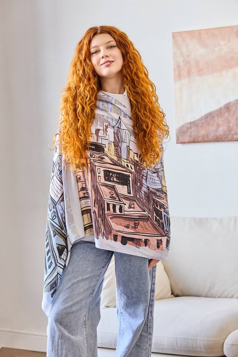 🧣Этот вискозный палантин будто сошёл со страниц путевого скетчбука: небоскрёбы, крыши, окна