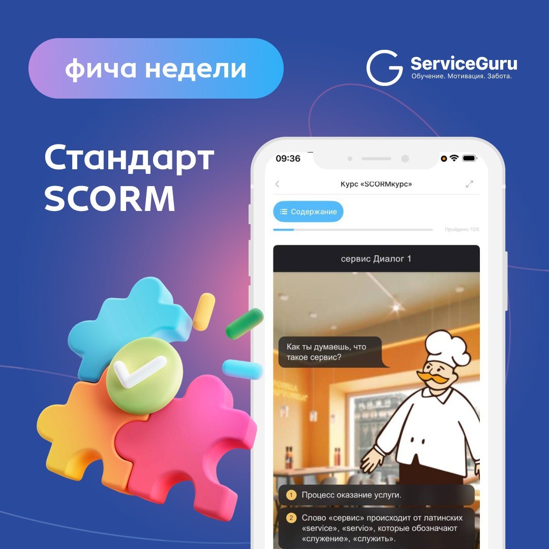 Фича недели: Стандарт SCORM 🎮 Больше возможностей для ваших курсов! Для всех, кто самостоятельно разрабатывает учебный контент и стремится к максимальной гибкости, у нас отличная новость: 🔥 ServiceGuru теперь полностью поддерживает SCORM — международный стандарт для электронных курсов. SCORM — это "универсальный язык" для курсов, который позволяет вам сделать обучение максимально гибким и эффективным: ✔️ Загружайте готовые курсы 🟡Вы можете использовать курсы, разработанные вашими методологами в любых сторонних SCORM-редакторах. 🟡Это позволяет быстро интегрировать готовый контент без необходимости пересоздавать его с нуля и ускоряет запуск обучения. ✔️ Получайте точную аналитику 🟡Система фиксирует статус прохождения, баллы за итоговые тесты и другие ключевые метрики, обеспечивая полную отчётность по обучению. 📌Не тратьте время на пересборку! Загружайте готовый SCORM-контент в ServiceGuru и запускайте обучение уже сегодня. 📎 Получить бесплатный демо-доступ на 14 дней #фича_