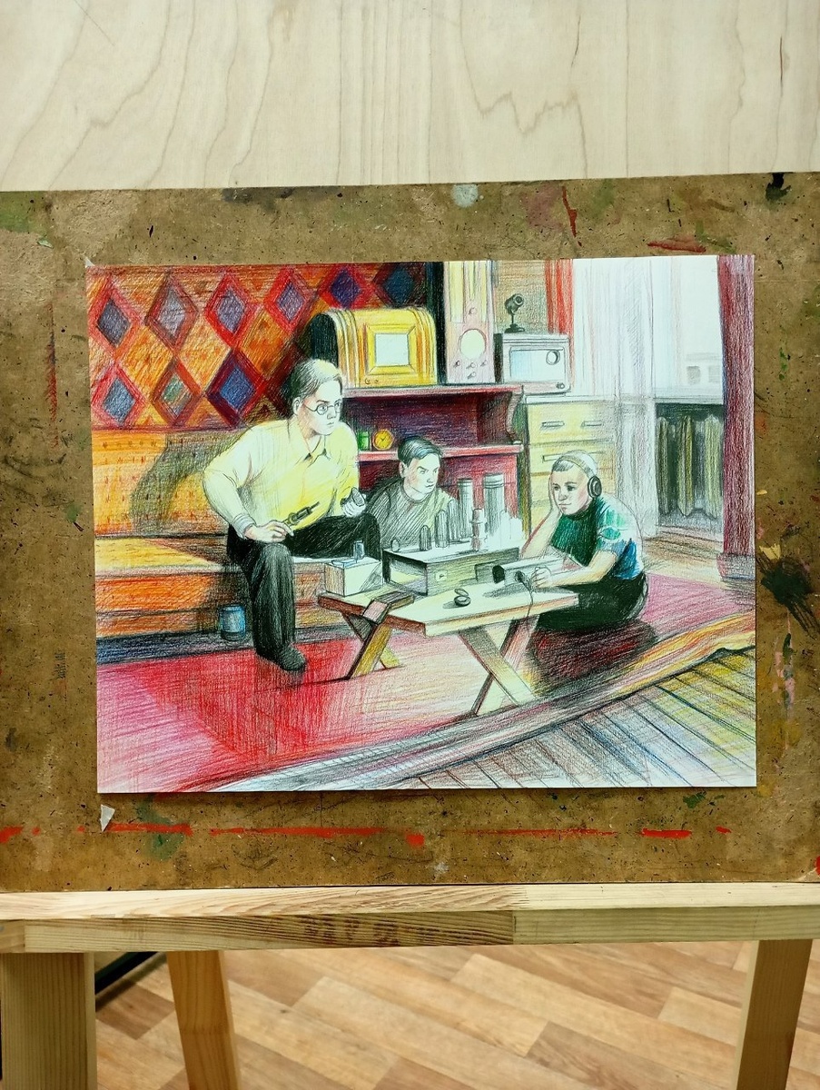 Набросок цветными карандашами «Юные радиолюбители