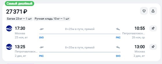 ✈️Москва - Петропавловск-Камчатский, туда и обратно за 27400 рублей 25 ноября - 2 декабря - https://checkintime.ru/1c7p 🏖 Поиск туров | ✈️Авиабилеты