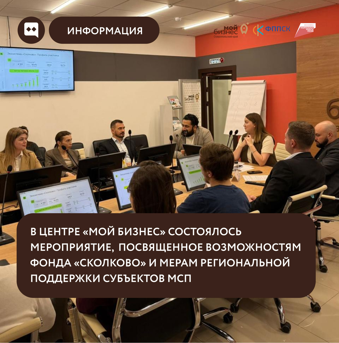 18 ноября 2025 года в центре «Мой Бизнес» состоялось мероприятие для предпринимателей Ставропольского края, которое было посвящено возможностям Фонда «Сколково» и мерам региональной поддержки субъектов малого и среднего предпринимательства. Программа мероприятия включила ряд экспертных докладов: А так же, эксперты рассказали о программах, направленных на стимулирование инновационной деятельности и развитие высокотехнологичного бизнеса в регионе. Такие мероприятия предоставляют предпринимателям уникальную возможность узнать о механизмах получения федеральной и региональной поддержки, задать вопросы экспертам в сфере инноваций и предпринимательства и наметить пути для развития своего бизнеса с использованием доступных ресурсов.