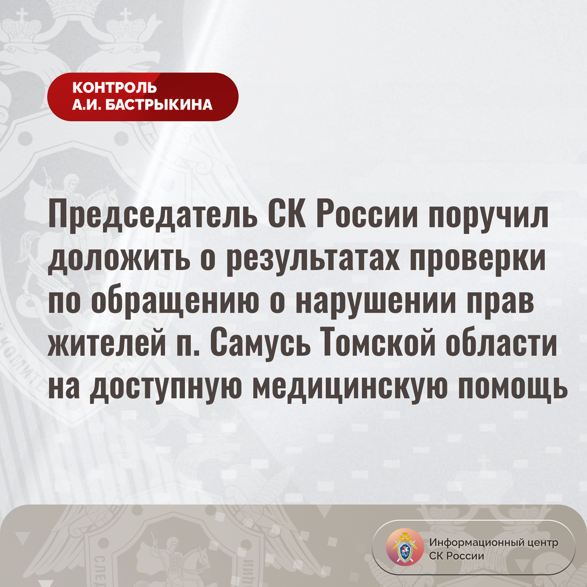 Председатель СК России поручил доложить о результатах проверки по обращению о нарушении прав жителей п. Самусь Томской области на доступную медицинскую помощь В социальной сети сообщается об обращении к Председателю СК России А.И. Бастрыкину жителей поселка Самусь Томской области по вопросу нарушения их прав на доступную медицинскую помощь. В связи с длительным отсутствием в населенном пункте станции скорой помощи местные жители вынуждены обращаться в учреждения, расположенные в значительной удаленности от мест их проживания. В ноябре текущего года в одном из поселков произошло дорожно-транспортное происшествие, в котором пострадал ребенок. Мальчик был вынужден ожидать прибытия бригады врачей из другого населенного пункта более часа в условиях низкой температуры воздуха, что представляло угрозу для его жизни и здоровья. Многочисленные обращения граждан в различные инстанции результатов не принесли. В СУ СК России по Томской области организована процессуальная проверка. Председатель Сл