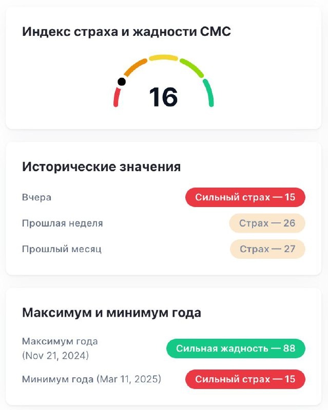 Сильный страх и жадность, исторически показывает противоположное значение роста или падения цен на рынке. 🤔 А мы сейчас очень близки к максимум страха.