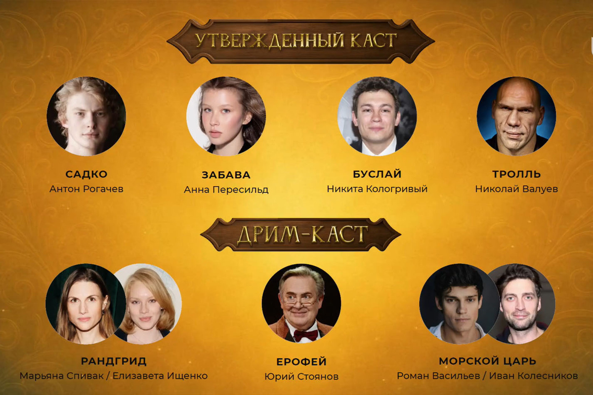 стоп-кадр трансляции Как несложно догадаться, главным героем фильма-сказки станет купец Садко, влюбившийся в княгиню Забаву после того, как он вернулся в Великий Новгород без гроша в кармане. Злая боярыня Глафира подстраивает события так, что Забава должна выйти замуж за царя, готового заплатить за брак с ней большие деньги. Чтобы спасти княгиню от брака с нелюбимым и получить возможность побороться за ее руку и сердце, Садко заключает сделку с морским царем. На заглавную роль утвержден Антон Рогачев («Этерна», «Жвачка»), а Забаву сыграет Анна Пересильд («Алиса в Стране чудес», «Слово пацана. Кровь на асфальте»). Также в фильме снимутся Никита Кологривый («Август», «Беги») и Николай Валуев («Каменная башка», «Миша портит все»), которому досталась роль тролля. Напомним, что в ноябре на экраны выходит киносказка «Маша и Медведи», где Валуев играет каменного великана. Похоже, боксеру и политику по душе подобные роли. Сергей Сельянов и Александр Горохов стоп-кадр трансляции Создатели фильм