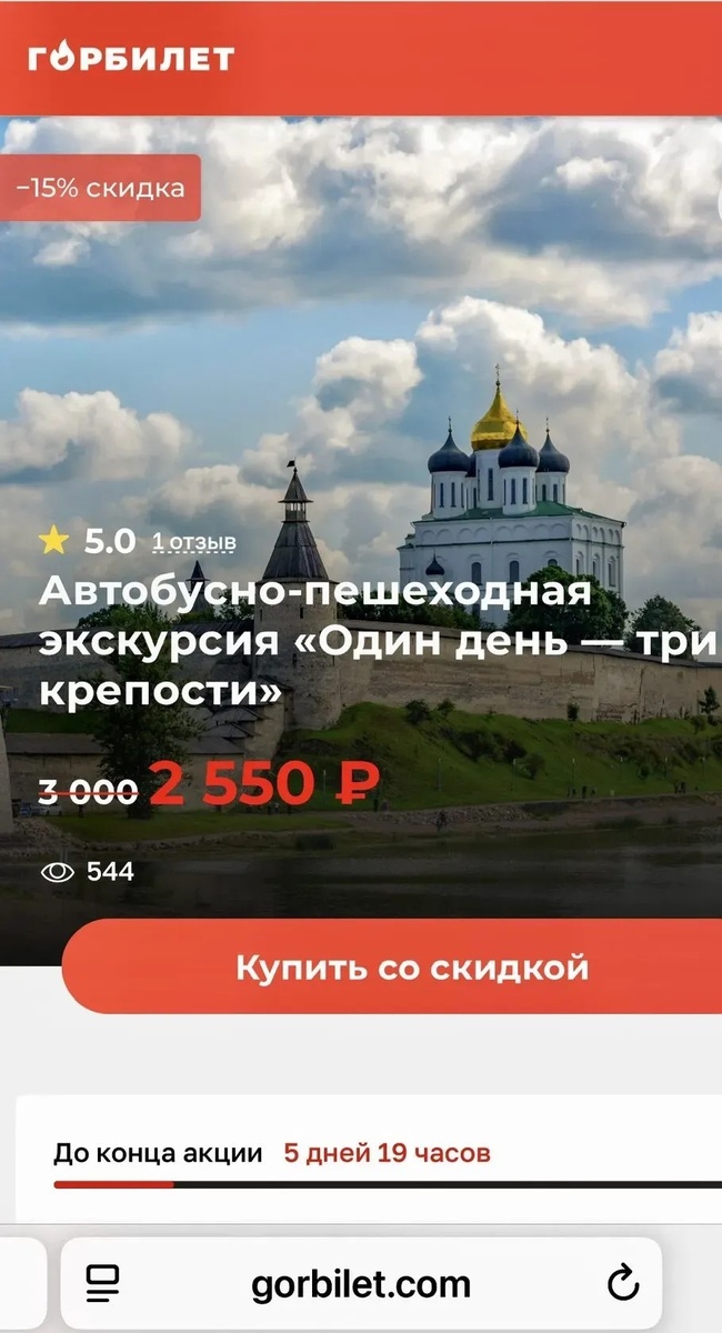 В прошлых постах я уже писала, что автобусная экскурсия в Печоры и Изборск обошлась мне дороже, чем проживание в Пскове. При этом, от пешеходной прогулки по Крому пришлось и вовсе отказаться — цены начинались от 2000 рублей с человека, плюс входной билет. Для двоих людей сумма получалась внушительная. Чтобы в будущем избежать таких трат, я решила заранее поискать способы сэкономить и нашла отличный сервис, где можно найти экскурсии и туры со скидками до 80%. Посмотрела, сколько я могла бы сберечь денег в Пскове, погрустила и добавила сервис в Избранное. Ведь он работает по всей России! Вот наглядный пример. На «Горбилете» я нашла автобусно-пешеходный тур «Один день — три крепости» за 2550 рублей + обед за 700. Итого: 3250 рублей. Я же заплатила за экскурсию в две крепости «Псково-Печорская лавра и Изборск» 3400 рублей. Уже экономия 150 рублей — можно купить набор открыток или магнит. Если учесть, что я отдельно платила за вход в Кремль (650 рублей), то общая выгода достигает уже 800