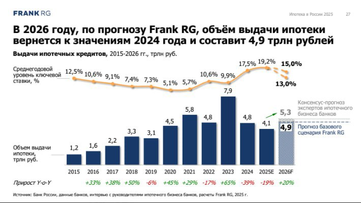 Эксперты компании ожидают снижения ключевой ставки Банка России в следующем году до диапазона 13%-15%, что спровоцирует рост ипотечных выдач, которые могут составить 4,90 трлн. рублей. В текущем году ожидается выдача ипотеки на 4,10 трлн. рублей.