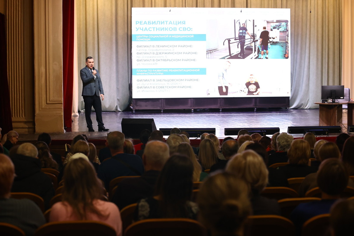 Прежде чем перейти к диалогу с жителями, глава города рассказал о результатах работы муниципалитета за два года. «На развитие нашего города направляются серьёзные средства. Мы максимально используем возможности бюджетов всех уровней, включаемся в реализацию национальных проектов, государственных и региональных программ. Работаем в тесном сотрудничестве с областным правительством и депутатами. Цель на ближайшие 10 лет – сформировать комфортную городскую среду с равномерно развитой социальной инфраструктурой и транспортным каркасом», – отметил мэр Максим Кудрявцев. Жители Калининского района задавали главе города вопросы о благоустройстве и озеленении территорий. Мэр Максим Кудрявцев отметил, что в этом году проведена большая работа: выполнена комплексная реконструкция газонов на улице Богдана Хмельницкого на площади почти 7 тыс. кв. метров, на улицах района высажено свыше 800 деревьев и кустарников. Благоустроены три зелёные зоны: на улицах Кропоткина, Тюленина, Фадеева. Также начата ра