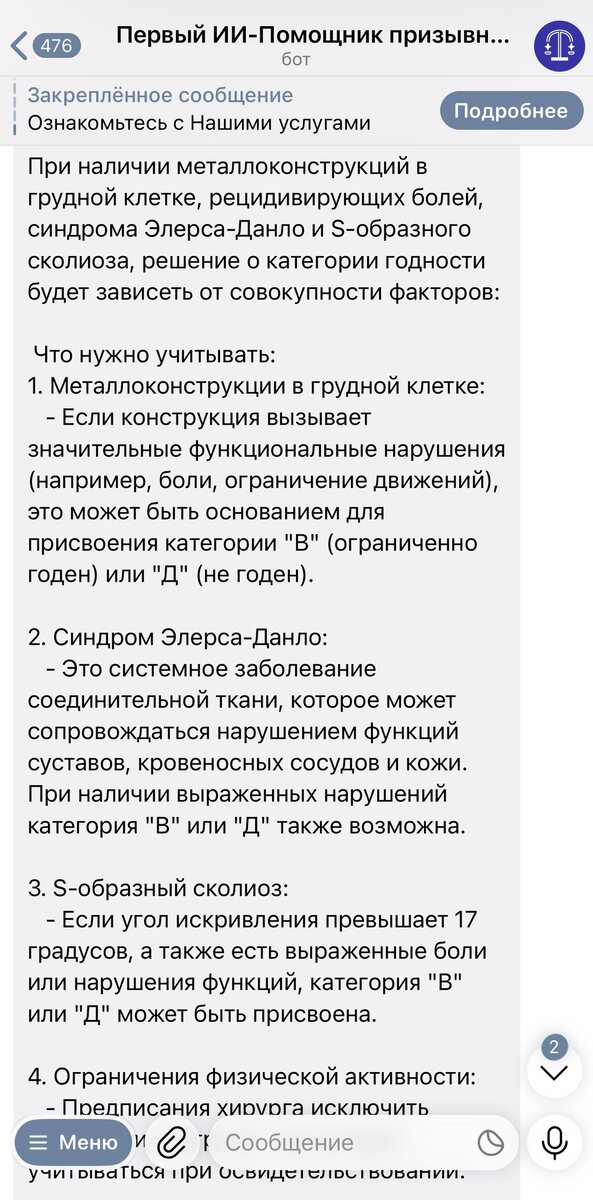 Определите, призывной ли ваш диагноз, за 1 минуту — напишите ИИ-Помощнику призывника Давайте посмотрим, как он делает первичный разбор, на примере вопроса от Ольги из чата: Добрый день! С металлоконструкций в грудной клетке возможно получить непризывную категорию? Диагноз ВДГК после операции по-Нассу. После операции прошло более 5 лет, врач говорит, снимать пластину травматично и нецелеосообразно. Кроме того, синдром Элерса-Данло, S-образный сколиоз 2-х отделов позвоночника шейного и грудного, градус угла искривления не уточнен. Хирург предписал исключить физические нагрузки - бег, кувырки, поднятие тяжестей. Периодические боли в грудной клетке. Ответ Помощника прикрепляю ⤴️ И вы так можете. Первые два запроса бесплатные. ➡️ узнать больше