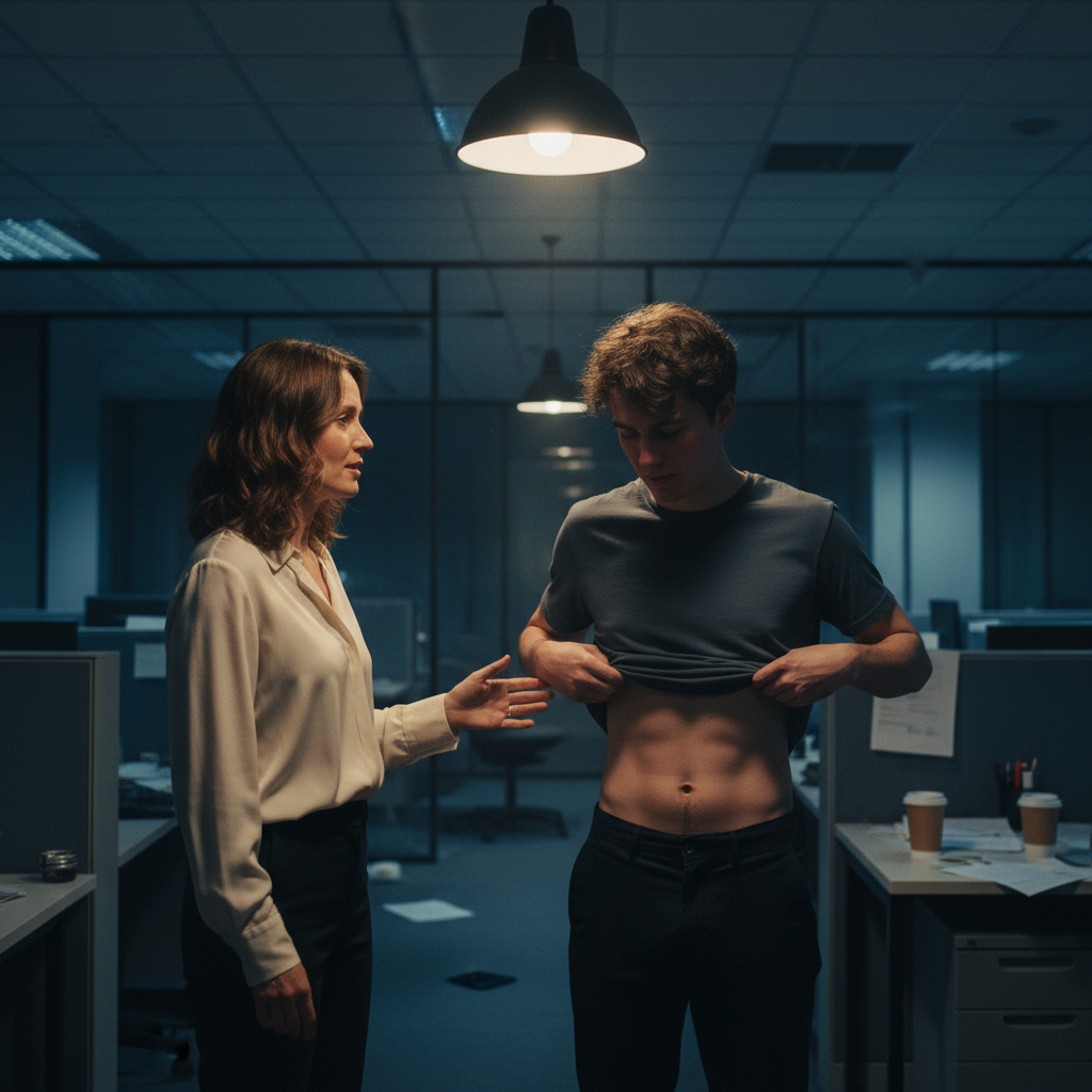 И вот однажды, когда сумерки сгустились за окнами и они снова остались одни, в кабинете повисло звенящее напряжение. Он сидел за своим столом, не поднимая на неё глаз. Пальцы его с видимым усилием, почти дрожа, потянули за край футболки. Медленно, застенчиво, он задрал её, обнажив гладкую кожу живота. Его рука легла на неё в неуверенном, почти робком поглаживании. Он смотрел на неё снизу вверх —