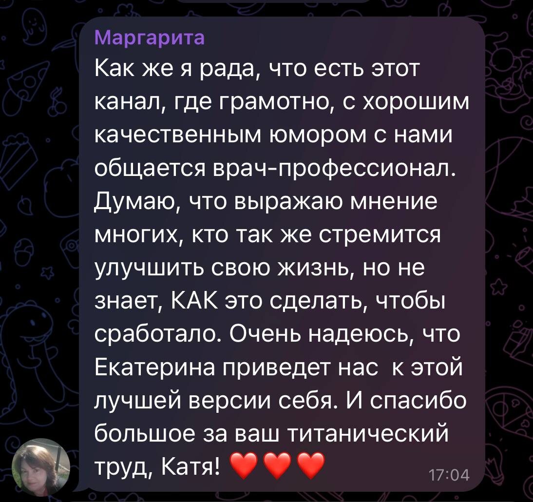 Тем временем в нашем закрытом канале... 🔐 Самые проворные счастливчики уже перенимают мою систему здоровья и готовятся к грядущим изменениям. Покажу вам пару отзывов😍 Участники: - Получают эксклюзивные материалы, которых нет в открытом доступе - Уже начали менять мышление и делиться первыми результатами - Стали моими соавторами в создании нового продукта А сегодня для них веду прямой эфир с возможностью задать вопрос напрямую Как попасть в закрытый канал ? Увы, уже НИКАК. Вход в канал закрыт. А все уже, всё. Надо было раньше запрыгивать в уходящий поезд. Но! Вы еще можете не пропустить старт продаж моего нового продукта. Я делаю его совместно с участниками закрытого канала, и открою продажи сначала для них. А потом для основного канала, если места конечно останутся😉Уверена, их разметут очень быстро, знают, что у меня всё серьезно, качественно и надолго. Поэтому в этот раз советую не зевать и следить за анонсами😉