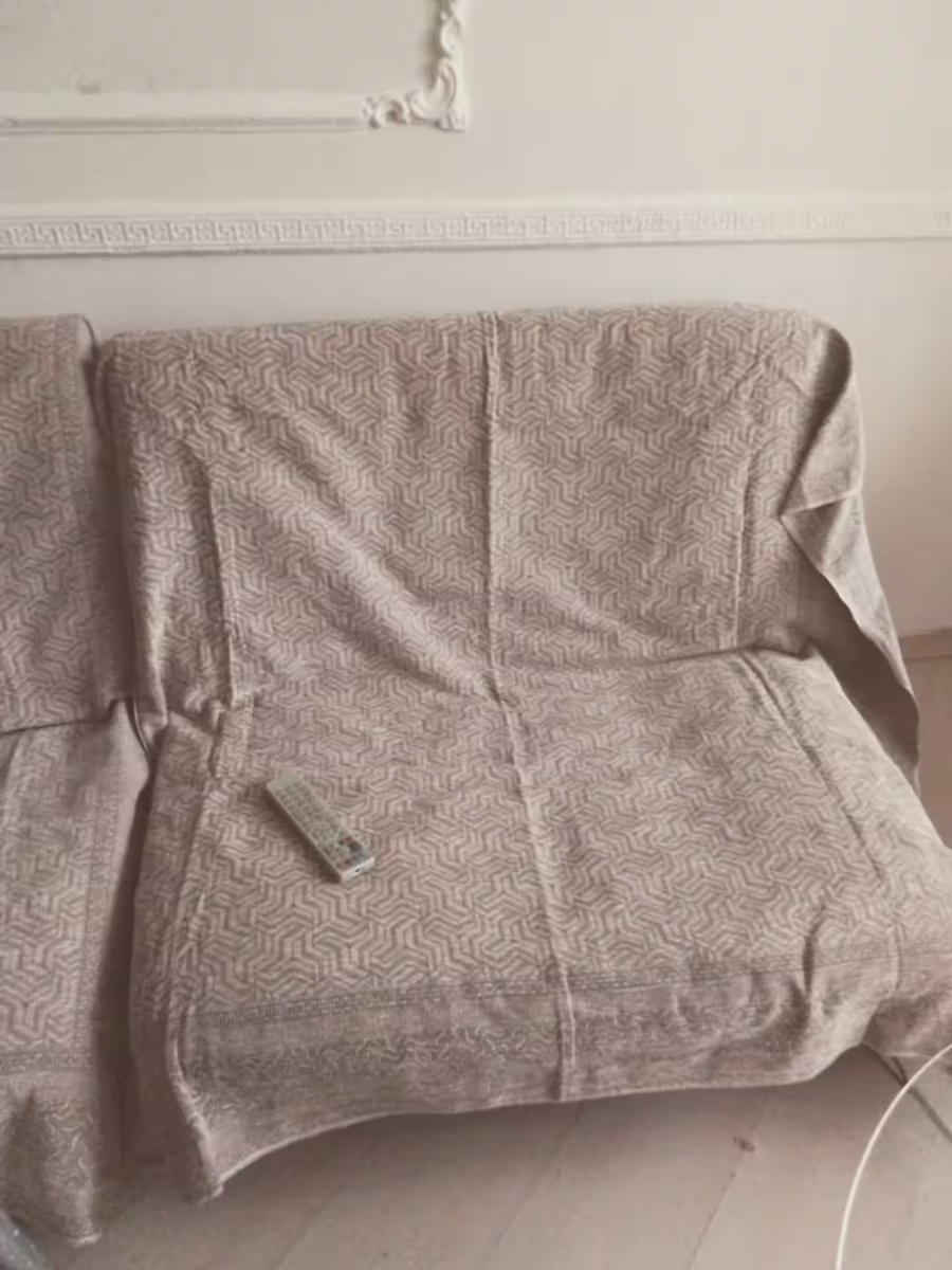 Вместо нормального дивана — странная конструкция, полностью затянутая бежевым покрывалом с заломами. Оно лежит так, как накрывают мебель, когда уезжают надолго, а не когда сдают жильё за сотку минус десять. Можно только догадываться, что скрывается под этим чехлом: цветастая «зебра» 2005 года, прожжённые подлокотники или раскладушка в боевой готовности.