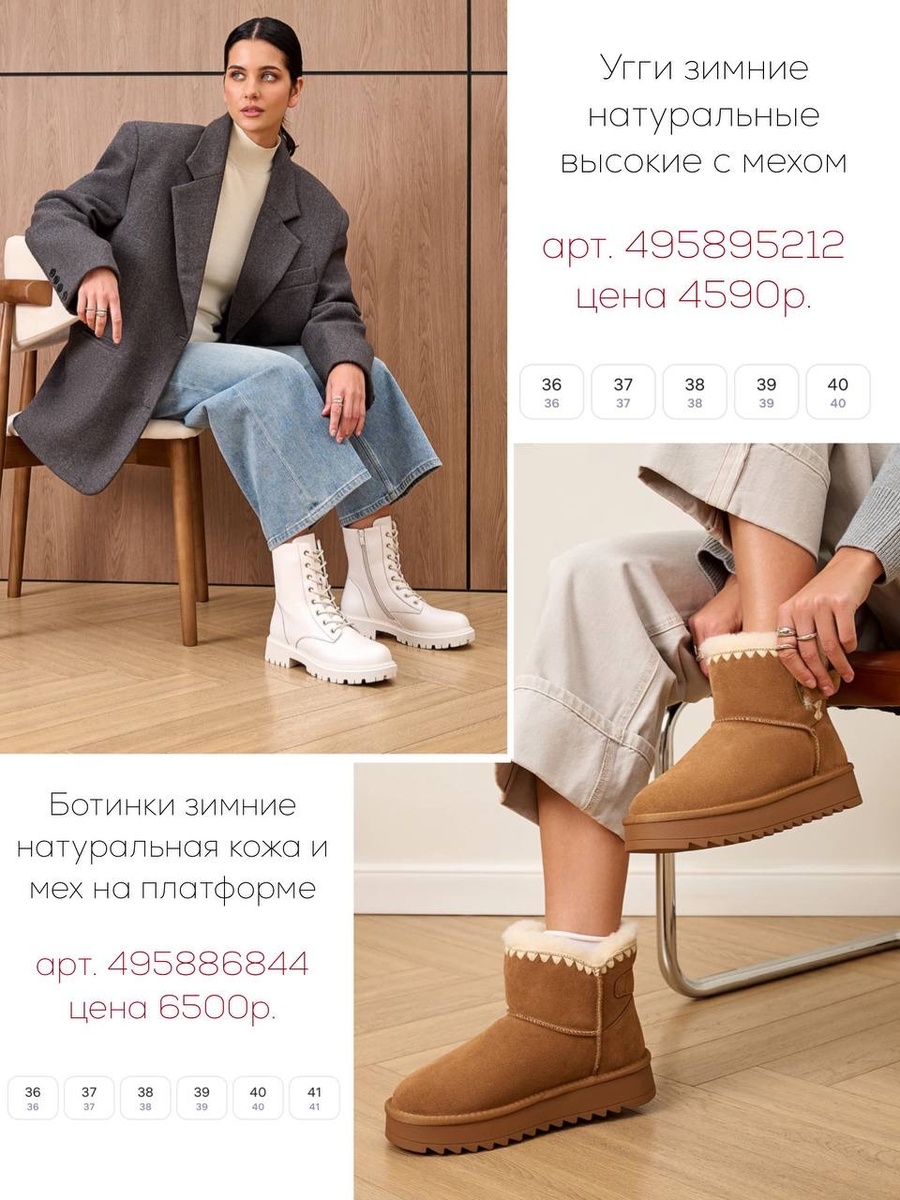 Эта подборка — идеальный гид по зимней обуви, которая не только согревает, но и делает образ стильным. Угги — мягкие и уютные. Ботинки на платформе — практичные и женственные. Зимние кроссовки — современный вариант, идеально подходящий для активной городской жизни.