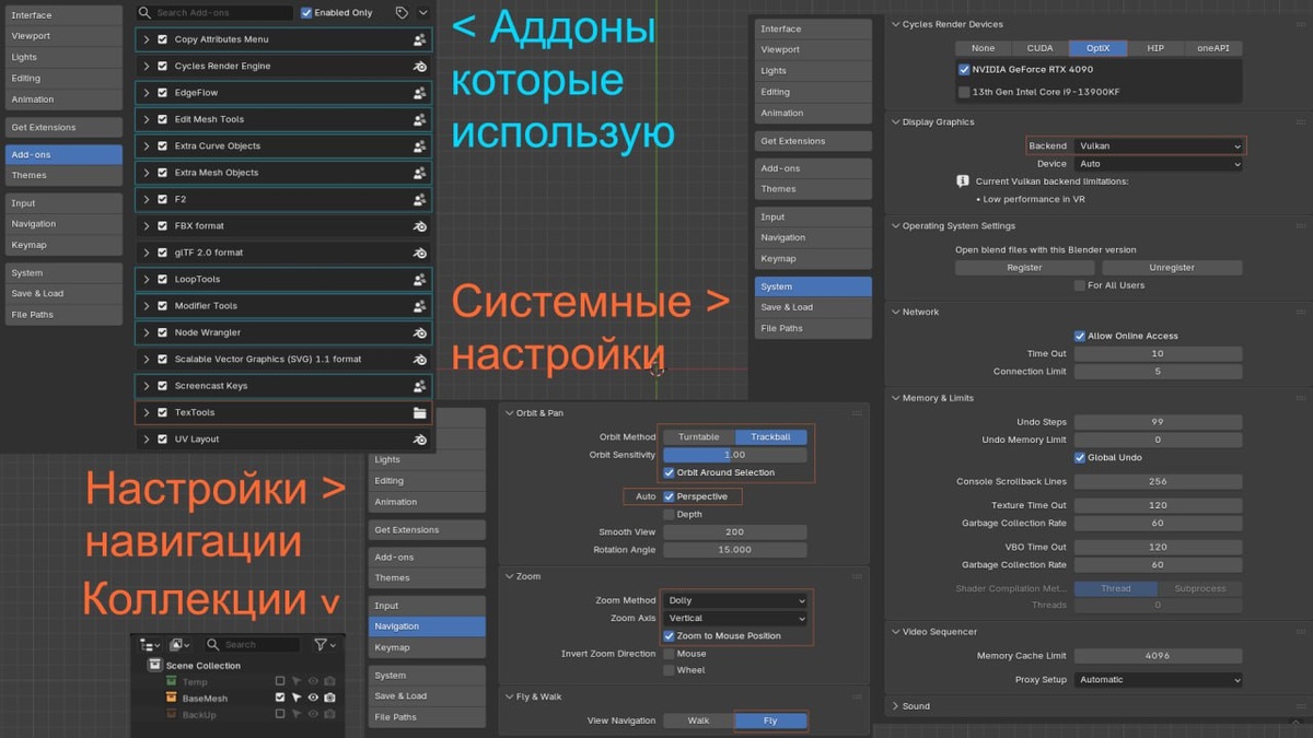 Первый день с Blender 5: настройка под свой workflow 🎨 Сегодня знакомился с новым Blender 5 — установка, настройка и чтение обзоров новых функций. Решил зафиксировать свои настройки и аддоны — это то, что облегчает работу и бесплатно. Есть ещё платные аддоны, которые я использовал ранее, но хочу немного поработать без них, тем более что некоторые пока не поддерживают новый Blender... тот же Pie Menu Editor. 🔧 Аддоны (Extensions), которые установил: Для моделирования: LoopTools — использую в основном для автоматизации работы с рёбрами: сгладить, расставить вертексы на равных расстояниях, преобразовать выделенную цепь из рёбер в круг, сделать bridge и т.д. F2 — незаменим, когда нужно быстро заполнить пространство полигонами Extra Mesh Objects и Extra Curve Objects — дополнительные примитивы. Иногда стандартных не хватает, например нужна просто точка или спираль. Edit Mesh Tools — редко используемые, но облегчающие моделирование приёмы. Главное не забыть про то, что они есть 😊 Tissue