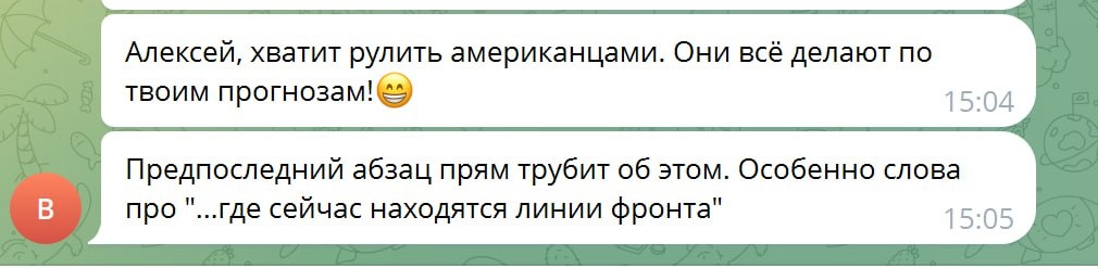 ‼️Белый дом хочет согласовать с Украиной и Россией рамочный документ о прекращении войны уже до конца ноября или даже этой недели, сообщает Politico. Это мирный план из 28 пунктов, который в США обсуждали спецпредставители США и РФ Уиткофф и Дмитриев. И, «похоже, план будет представлен Зеленскому как свершившийся факт» на встрече с американским министром в Киеве. «Они считают, что Украина, учитывая коррупционные скандалы, которые преследуют Зеленского, учитывая, где сейчас находятся линии фронта, что находится в положении, когда… они чувствуют, что могут заставить её принять эту сделку. Они говорят, что это разумно; это то, что, по их мнению, будет приемлемо для Украины», - пишет издание. ☝️А сколько было хейта, когда я вам рассказывал последний месяц, что негласные переговоры идут прямо сейчас и не останавливаются.... 🧐Получите, распишитесь... умные люди нашу аналитику не критикуют 😉