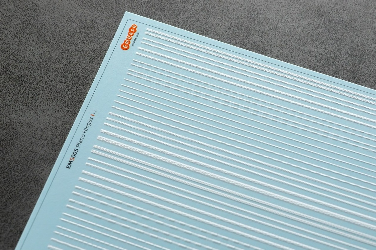 Embase из Твери выпустила "трехмерные декали" для имитации рояльных петель и элементов силового моделях на моделях разных масштабов: Рояльные петли (каталожный номер EMS005) Элементы силового набора (EMS006)