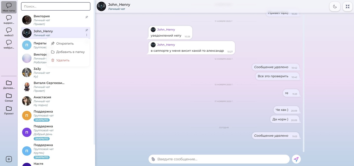 Lymess.com Процесс разработки Мессенджера, интегрированного с вашими Сервисами. 1. Контроль и общение с сотрудниками. 2. Общение между пользователями. 3. Создание папок и бесед. 4. (Временно закрыто) Общение через Виджет-чат онлайн с посетителями вашего сайта. 5. (Временно закрыто) Отдельный раздел для общения с теми , кто интересуется вашими Услугами или Товарами в Маркетплейсе.