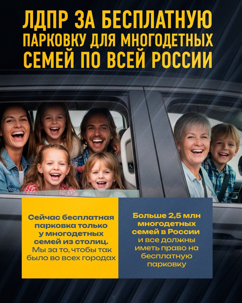 Автопарковки для многодетных семей должны быть бесплатными по всей России Предлагаем предоставить многодетным семьям право на бесплатную парковку на всех платных парковках России. 📃 Согласно законопроекту, право на бесплатную парковку распространяется на один автомобиль, принадлежащий одному из родителей. На сегодняшний день подобным правом обладают многодетные родители в Москве и Санкт-Петербурге. Однако, как заметил Председатель партии ЛДПР Леонид Слуцкий, большинство российских многодетных семей живут как раз не в столицах. Всего таких семей в России сейчас свыше 2,5 млн и многие не могут себе позволить лишние расходы. «Если мы действительно хотим укреплять институт семьи, то ситуацию нужно менять! Родители, подарившие жизнь трем и более детям, не должны выбирать между удобством и экономией. Именно поэтому ЛДПР предлагает на федеральном уровне ввести единое правило: каждая многодетная семья должна иметь право на бесплатную парковку одного автомобиля, принадлежащего одному из роди