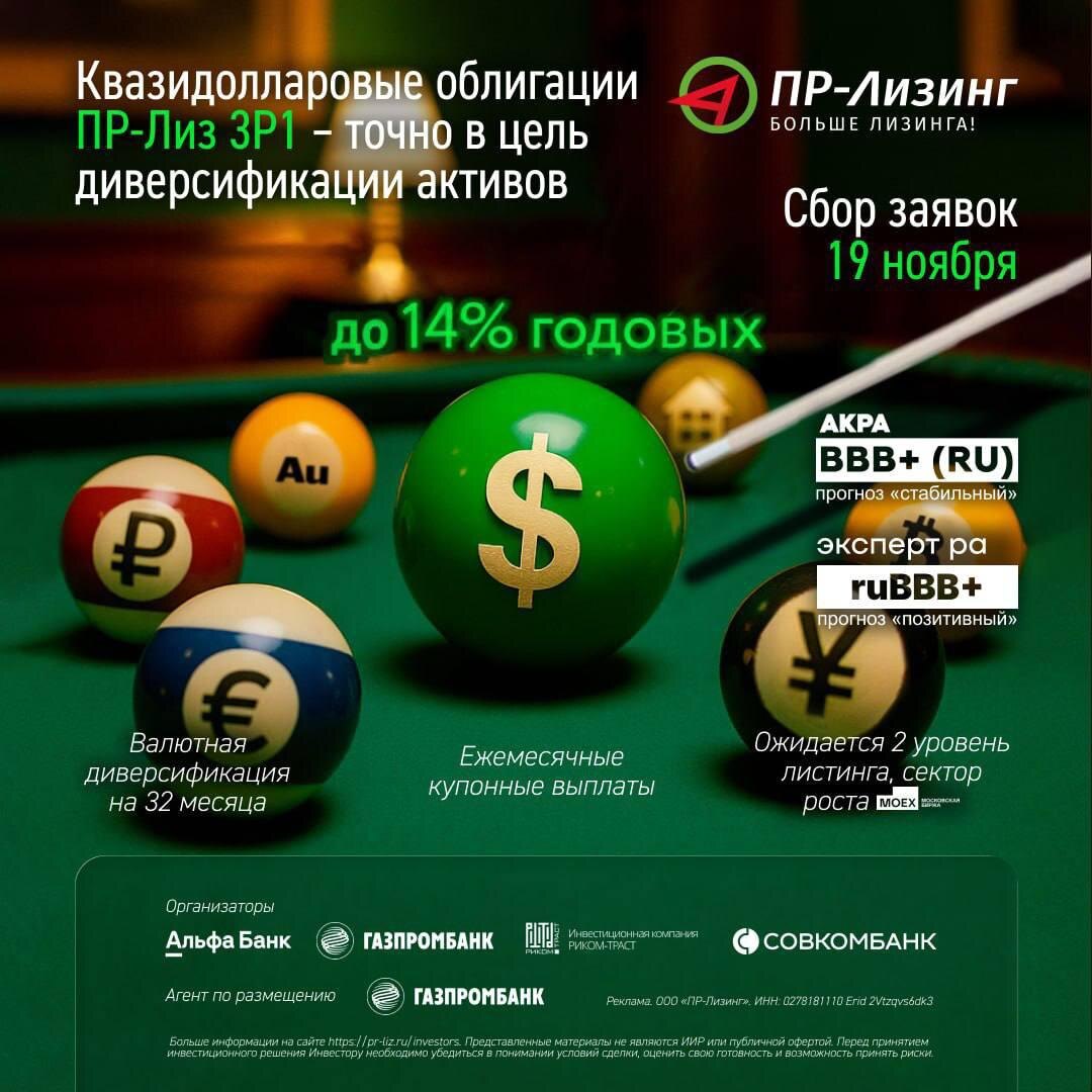 ПР-лизинг: новый бонд Всем привет! Компания выпускает новый выпуск - теперь это квазивалютные облигации. Расчеты в рублях, но выплаты привязаны к доллару. Это компания из сферы лизинга, работают с 2011 года и представляют широкую сферу лизинга различного имущества - преимущественно для нефтегазового сервиса и промышленного сектора (оборудование + транспорт). Сейчас в обращении 4 выпуска облигаций. Ранее писал про них летом - тогда закрыли книгу за один день. Финансовое положение Это рейтинг BBB+ от Акры и Эксперта. Лизинговый портфель/NET DEBT=1,7X Компания с лизинговым портфелем на 15,3 миллиардов рублей и капиталом в 1,5 миллиарда рублей. Выручка за 9 мес 2025 выросла на 2% г/г до 1,76 миллиарда рублей. Чистая прибыль выросла за 9м 2025 выросла на 43% г/г до 120 миллионов рублей. ROE около 11%. Параметры выпуска: Не менее $20 миллионов Номинал $100 Ставка купона до 14% в долларе Купон каждый месяц Погашение через 2,5 года Амортизация по 11% в даты 8, 11, 14, 17, 20, 23, 26, 29