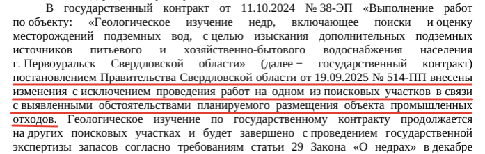 Мы уже ранее писали об этом неоднократно - что 11 июня 2025 г. ФГКУ «РОСГЕОЛЭКСПЕРТИЗА» выдала положительное экспертное заключение № 126-02-06/2025 по проектной документации на выполнение работ по объекту: «Геологическое изучение недр, включающее поиски и оценку месторождений подземных вод, с целью изыскания дополнительных подземных источников питьевого и хозяйственно-бытового водоснабжения населения г. Первоуральск Свердловской области» в рамках Государственного контракта № 38-ЭП от 11 октября 2024 г по заказу Министерства природы и экологии РФ. (ИКЗ 242666108965866700100100030017112244).