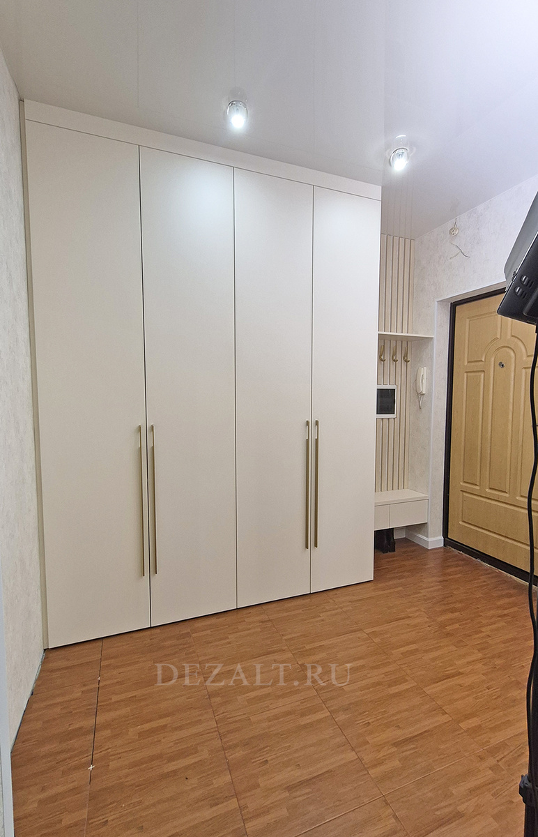 Привезли двери, установили. Двери высокие, внутри в них корректоры против изгиба. Две двери регулировал корректорами, исправлял изгиб, а две другие даже трогать не пришлось. Изгиб лазером проверял конечно. Ну вот наверняка бы знать, будут кривые двери или нет, можно корректоры тогда ставить или не ставить. Но и во время эксплуатации мебели, двери редкий раз тоже может выгнуть в одну или в другую сторону. Напоминаю, стены были неровные, корпус мы делали 3 дня. Долго возился с планками настенными. Сам придумал их делать шириной в 40мм, сам потом страдал с ними. Гриша под конец уже длину мне отпиливал нужную. Потолок натяжной натянут неровно, верхние планки мы подпиливали у клиента, чтобы вверху смотрелось логично по отношению к потолку. Я умиляюсь с мебельщиков, которые залетают и начинают мне тут наваливать типа - вы идиоты, 3 дня корпус собирать... вы придурки и т.д. Я с планками только день возился. Все кривое, косое, сверху снизу где эл. щит сверлить нельзя. Крючки нужно закрепит