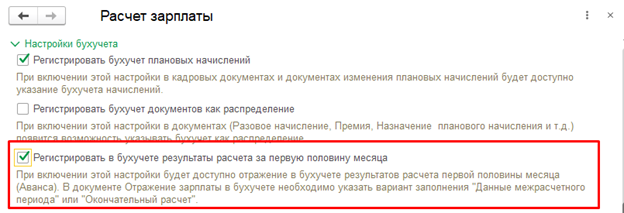 Как сформировать сведения для отражения зарплаты в бухучёте за первую половину месяца в 1С:ЗГУ?