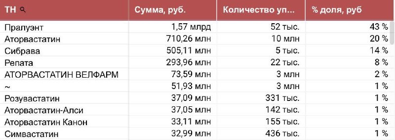 В испытаниях фазы 3 у ~2912 участников с высоким риском (после инфаркта или инсульта) благодаря приёму Enlicitide за 24 недели удалось снизить уровень ЛПНП примерно на 60%. Препарат действует как оральный ингибитор белка PCSK9, тогда как большинство аналогов — инъекции. Если препарат получит одобрение от FDA, это может стать прорывом в лечении гиперлипидемии и значительно расширить возможности для пациентов. Всего объём продаж составляет - 3,61 млрд руб., 18 млн упак. 🚛Топ-3 поставщиков: 1. ООО Ирвин 2 - 548,86 млн руб.; 2. АО Ланцет - 313,06 млн руб,; 3. ООО Медипал-онко - 311,31 млн руб. Лидирует инъекционный 🥇ТН Плалуэнт (Санофи) с объёмом продаж 1,57 млрд руб., 52 тыс упак. На втором месте 🥈Аторвастатин (Озон, доля 90,59%) 710,26 млн руб., 10,41 млн упак. На третьем месте инъекционная 🥉Сибрава (владелец РУ Новартис) - 505,11 млн руб., 4,55 тыс упак. С остальными ТН, входящими в ТОП-10 (АТХ С10) можете ознакомиться на слайде: