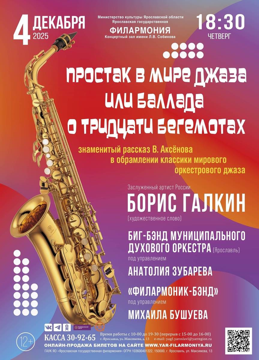 📢 4 декабря 2025 года, в 18:30, Ярославская государственная филармония приглашает вас в необычное путешествие! 🎷🎤🎷🎹🎸 Погрузитесь в атмосферу легендарного джазового фестиваля 1967 года в Таллине, ожившую благодаря блестящему рассказу Василия Аксёнова «Простак в мире джаза или Баллада о тридцати бегемотах». 👉 https://quicktickets.ru/yaroslavl-filarmoniya/s148 🎶 Вас ждет виртуозное исполнение классики джаза от Биг-бэнда Муниципального духового оркестра под управлением Анатолия Зубарева и зажигательные импровизации от «Филармоник-Бэнд» под управлением Михаила Бушуева. 🎤 Борис Галкин, заслуженный артист России, перенесет вас в самое сердце событий. Вы услышите, как «тридцать бегемотов» – могучие контрабасы – отправляются в Таллин, чтобы стать частью неповторимого звучания мирового оркестрового джаза. Не упустите шанс стать свидетелем этого уникального концерта!