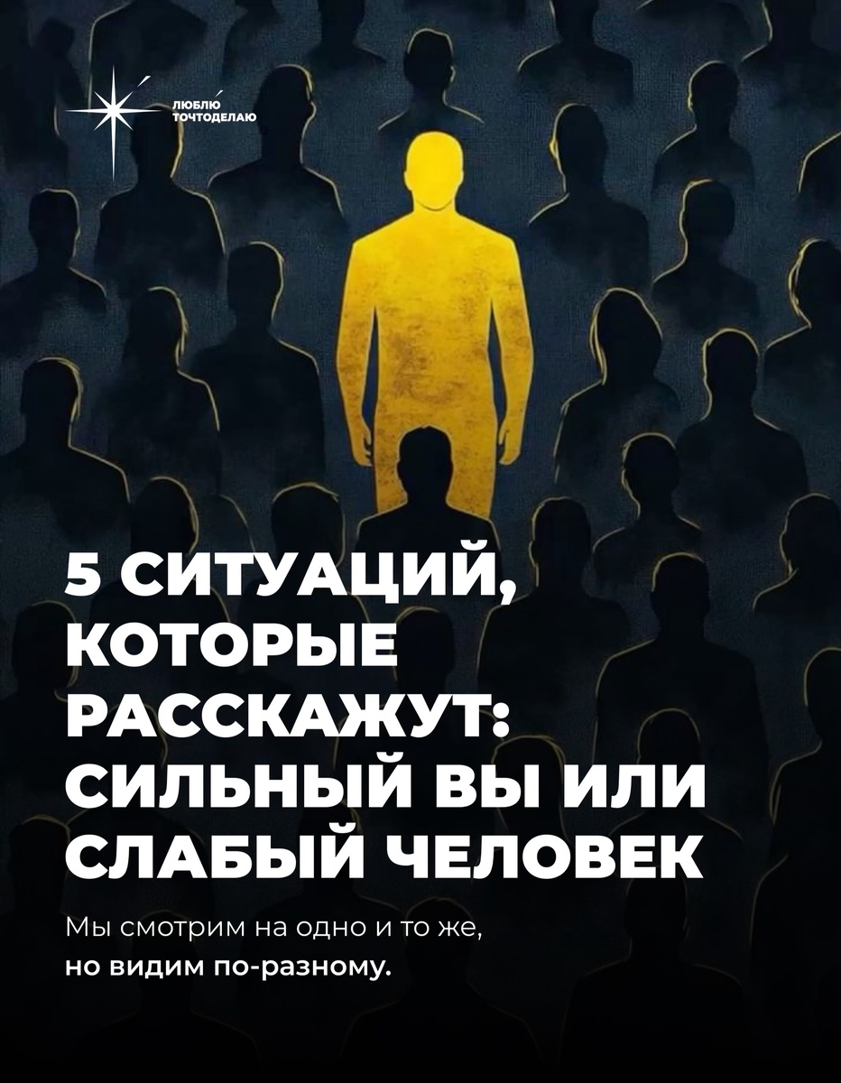 Мы все смотрим на одно и то же, но видим разные вещи. В этом и начинается разница между силой и слабостью — не в том, что с нами происходит, а в том, как мы это воспринимаем. Когда мы замечаем чужую ошибку, кто-то смеётся, ищет повод почувствовать превосходство, говорит: «Ха, какой неудачник!» А кто-то другой задаёт совершенно другой вопрос: «Чему это меня учит? Как мне избежать этого?» Сильные учатся. Слабые — ищут повод самоутвердиться. Когда речь идёт о чужих проблемах, слабые обсуждают их, чтобы почувствовать себя лучше: «У него всё хуже — значит, я в порядке». Им нужно утешение в чужих неудачах. Сильные же анализируют. Они ищут урок, спрашивают себя: «Как мне не попасть в ту же ловушку?» Когда мы строим отношения, слабые объединяются через осуждение и сплетни. Это просто, быстро и фальшиво. Сильные выбирают другой путь — говорят честно, делятся уязвимостью, показывают себя настоящих: «Вот с чем я борюсь». И именно поэтому строят глубокие, живые, настоящие связи. Когда мы ви