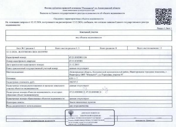 Название: Лот№3 Подвергнутое аресту Кингисеппского РОСП по и/п 143962/24/47024-ИП и принадлежащее должнику Плющевой М.М арестованное имущество: земельный участок общ.пл. 430 кв.м. кадастровый № 47:21:0305001:136, расположенный по адресу: ЛО, Кингисеппский район, г. Ивангород, , ОНТ «Южный-1», ул. Гороховая, уч. 97. Канал: Госземля Ленинградская область Область: - Район: - Населенный пункт: - Локация: Смотреть на карте ВРИ: Производственная деятельность Кадастровый номер: 47:21:0305001:136 Кадастровая стоимость: - Вид сделки: Продажа Площадь: 430 м² Начальная цена: 90000.00 руб. Дата завершения: 18.12.2025 Подробнее: ГИС ТОРГИ #госземля #земляотгосударства #земля #земельныйучасток #земельныеторги #торги #аукцион #продажаземли #продажа #ленинградскаяобласть