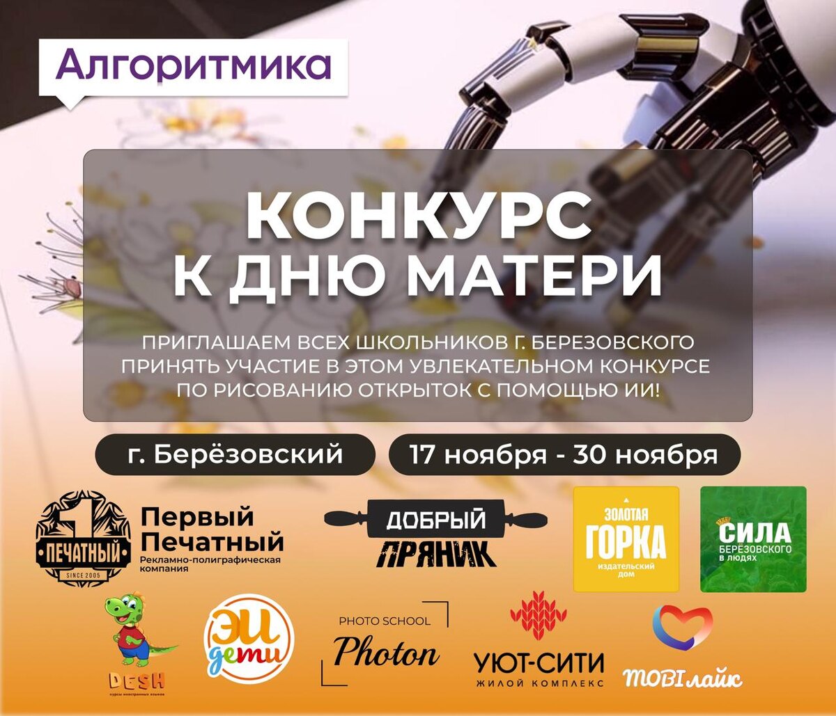Мы в ожидании замечательного праздника – Дня мамы. И поэтому с радостью присоединяемся к конкурсу от школы программирования «Алгоритмика». Они запускают конкурс рисунков с помощью искусственного интеллекта. – Приглашаем всех школьников Березовского проявить свои творческие способности и познакомиться с удивительными возможностями ИИ. Создайте яркую, оригинальную открытку, вдохновленную женственностью, уютом и технологиями, и выиграйте крутые призы! Конкурс стартовал 17 ноября и завершится 30 ноября. Отправить заявку и узнать подробности на сайте: draw8brz.tilda.ws А мы обязательно покажем вам результаты. @zg66 | Мы в МАХ
