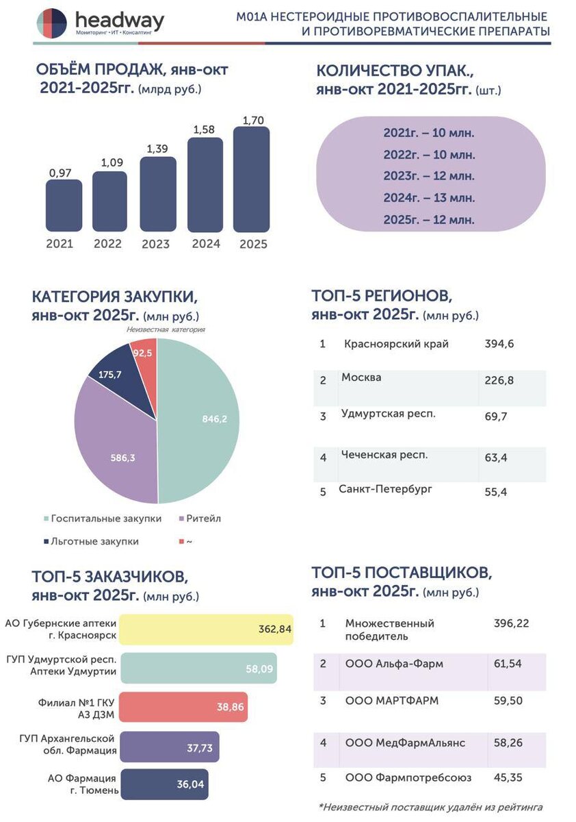 На прошлой неделе Промомед анонсировали выход на рынок ТН Райтбуфен (правовращающий изомер ибупрофена, МНН дексибупрофен). На сегодняшний день данный препарат уже успел поучаствовать в гос.закупках в количестве 2 упаковки , Заказчиком которого является Фармация Удмуртской республики, по цене за упаковку: 400мг №20 - 512,82 руб. 400мг №10 - 272,46 руб. А что с госзакупками НПВС и противоревматических ЛС в янв-окт 2025г.? Рынок НПВС планомерно растёт в деньгах, но падает в количестве упаковок и контрактов. 💰 Объём продаж +7,6% в рублях (1,76 млрд руб.) –7,7% в упаковках (12 млн упак.) –5% по кол-ву контрактов (17 871 шт.) 💊Топ 10-ТН — кто растёт, кто падает 🔺 Лидеры роста: Мелоксикам - 42,61 млн руб., +50,9% Кетопрофен-АКОС - 37,5 млн руб., +47,0% Инъектран - 55,59 млн руб., +42,5% Кетопрофен Органика - 46,34 млн руб., +37,6% 🔻 Падения: Интрафен-ГЕН – 61,87 млн руб., -28,5% Ксефокам –60,63 млн руб., -28,7% Диклофенак, Ибупрофен вышли из Топ-10 с падением 15,5% и 10,6% соответствен