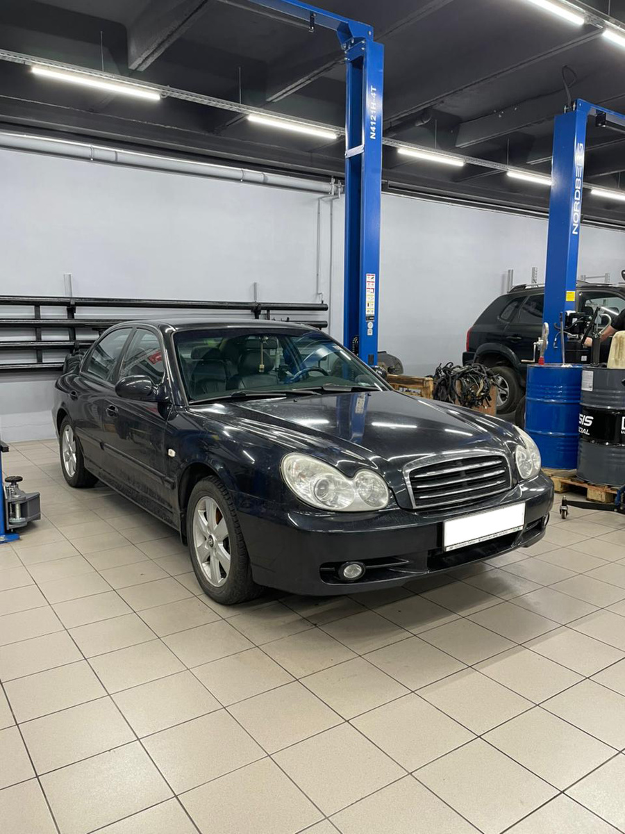 В наш сервис обратился владелец Hyundai Sonata 2008 года выпуска с двухлитровым двигателем G4GC на замену комплекта ГРМ и водяной помпы. Общий пробег автомобиля составляет всего 130 тысяч километров. Автомобиль в нашем цеху Подготавливаем новые запчасти. Будем производить замену комплекта ГРМ, сальника распредвала, переднего сальника коленчатого вала, водяной помпы, приводных ремней и прокладки клапанной крышки Приступаем к работе, снимаем декоративную крышку двигателя Снимаем верхний кожух ГРМ Снимаем приводные ремни. Один ремень натягивается насосом гидроусилителя руля, второй ремень генератором Снимаем правое переднее колесо Ремень компрессора кондиционера натягивается роликом, ослабляем и вытаскиваем Откручиваем болт шкива коленвала и демонтируем Далее откручиваем шкивы водяного насоса и нижний кожух ГРМ. Перед началом замены проверяем метки ГРМ, совмещаем отверстие в шестерне распредвала со специальным посадочным местом. А также выставляем шестерню коленвала по меткам Поставив