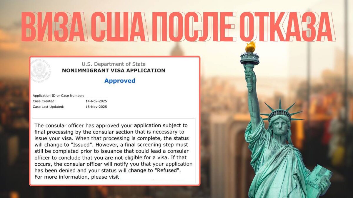 Виза США после отказа 18 ноября: одобрение повторной визы США после отказа гражданке России Кейс: девушка, в гражданском браке, работает техническим аналитиком в крупной компании, стаж более 10 лет. Отказ в визе США был в 2023 году. За последние 5 лет посещено 7 стран. Собеседование Клиент проходила самостоятельно на английском языке. Вопросы консула: – Какая цель Вашего визита? – Куда собираетесь поехать? – С кем поедете? – Чем занимаетесь на работе? После ответов на вопросы консул одобрил визу США. Получить визу США ⬅️ Записаться на консультацию ⬅️ #кейс #виза_сша #виза_после_отказа