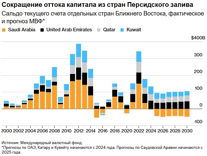 Быстро растущие внутренние расходы истощают нефтедолларовый фонд стран Персидского залива, которые ранее инвестировали свои средства за рубежом. Катар, например, вложил 300 миллиардов долларов в подготовку к чемпионату мира по футболу 2022 года. Саудовская Аравия, возможно, планирует выделить более 1 триллиона долларов на создание футуристических городов, развитие спорта и развлечений. Нефтяные деньги, ранее направлявшиеся в надежные американские облигации, теперь инвестируются в более рискованные проекты. В условиях сокращения доходов и увеличения внутренних расходов суверенные фонды благосостояния стран Персидского залива перенаправляют капитал в акции, горнодобывающие компании и недвижимость, вместо того чтобы продолжать кредитовать правительство США.