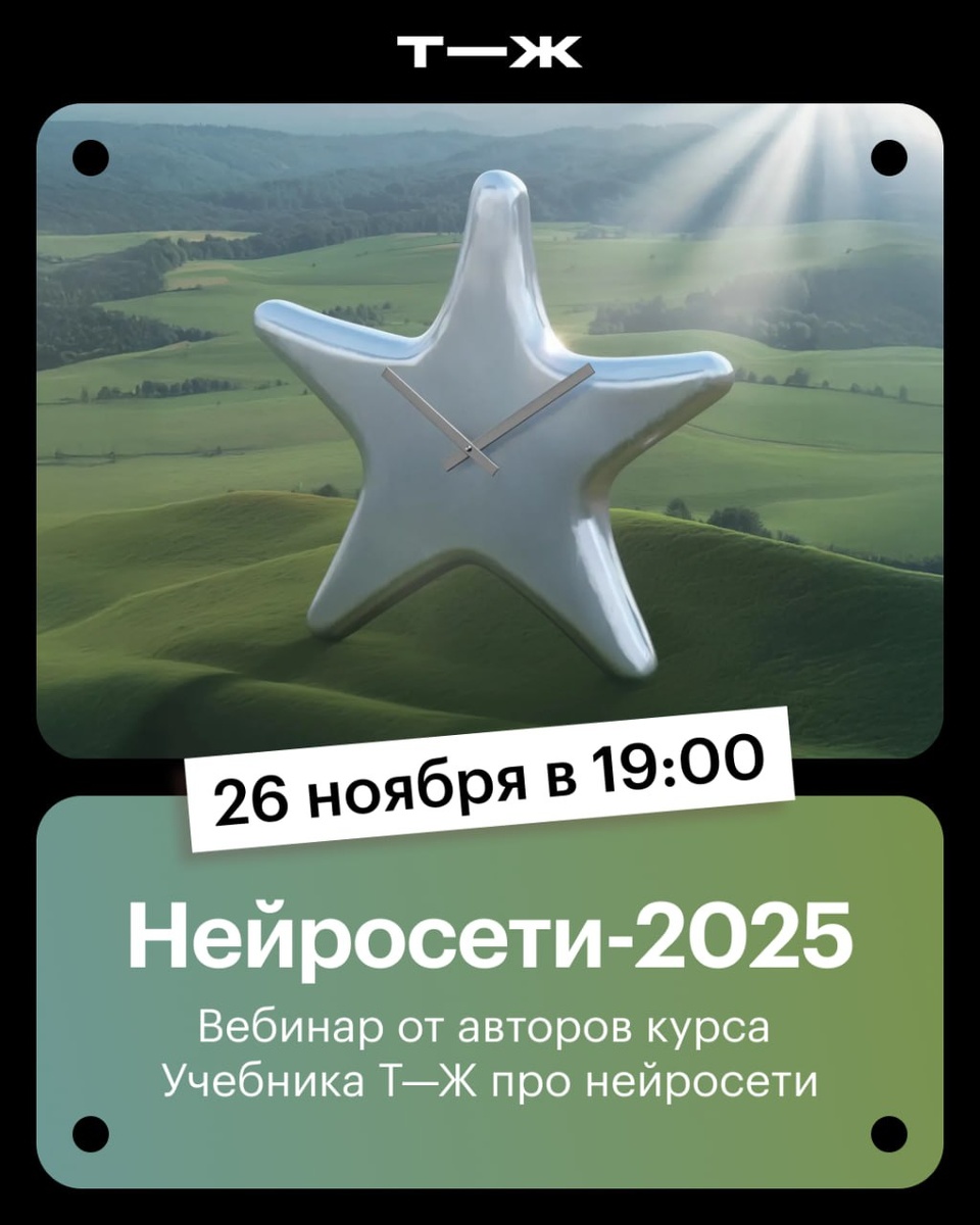 — В этих ваших нейросетях все так быстро меняется, столько разных версий, что-то новое постоянно выходит… Спокойно, во всем разберемся — всего за час. Устраиваем бесплатный вебинар о главных ИИ-новостях 2025 года с Евгением Кузьминым, автором курса Учебника Т—Ж «Как упростить себе жизнь с помощью нейросетей». О чем расскажем: ◾️ что изменилось в нейросетях за последний год; ◾️ как выбрать подходящий сервис; ◾️ какие навыки промптинга до сих пор актуальны. Встреча подойдет как новичкам, так и продвинутым пользователям. А кроме информации всех слушателей ждут полезные материалы от автора, скидка 40% на любой платный курс Учебника Т—Ж и сертификат участника! Вебинар пройдет 26 ноября в 19:00. Регистрируйтесь по ссылке: https://l.tbank.ru/webinaraitg1911