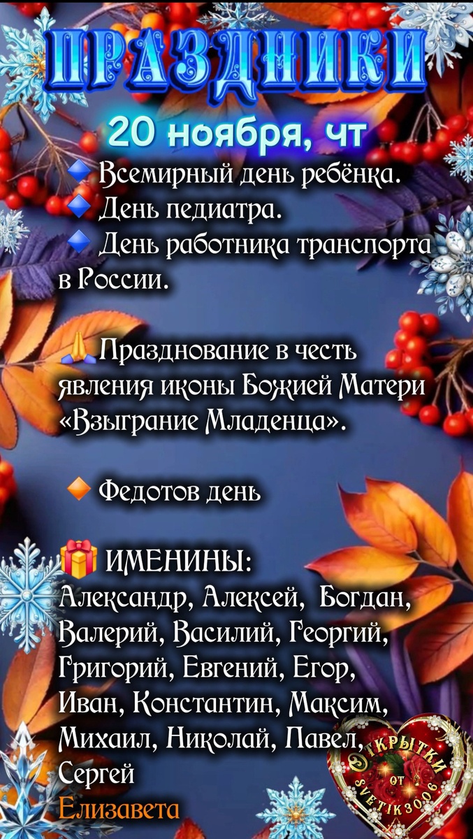 🔹️Всемирный день ребёнка. Согласно данным ООН, более 333 млн детей в мире (или каждый шестой ребенок) живут в условиях крайней нищеты, а десятки миллионов не имеют возможности получить образование и медицинскую помощь. Интересные факты: 👼Рекорд по многодетности принадлежит россиянке Валентине Васильевой, жившей в XVIII веке. Она родила 69 детей. 👼Детская память начинает формироваться около трех лет. Всё, что было до этого, уходит в категорию так называемой детской амнезии. 👼У новорожденных насчитывается около трех сотен костей — намного больше, чем у взрослых, ведь многие из них позже соединяются, формируя крепкий скелет. 👼В первые месяцы жизни у них сохраняется нырятельный рефлекс, автоматически защищающий дыхательные пути при попадании в воду.