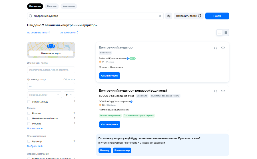 Если на HeadHunter задать поиск «Внутренний аудитор» и поставить фильтр «Без опыта», то на 18.11.2025 увидим такую картину. Причём ни одна из этих вакансий не предполагает задач внутреннего аудитора — скорее, обязанности похожи на секретарские.