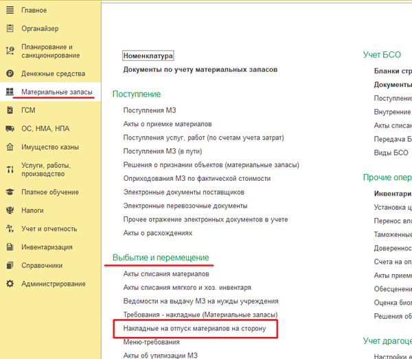 Безвозмездная передача материалов в рамках межбюджетного перемещения в 1С: БГУ 8
