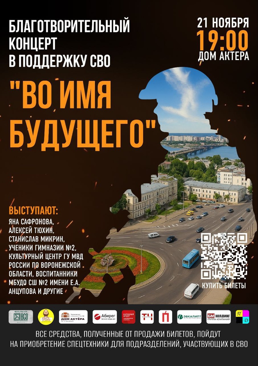 21 ноября в 19:00 в Воронежском Доме Актера состоится благотворительный концерт «ВО ИМЯ БУДУЩЕГО», посвященный поддержке участников специальной военной операции. Мероприятие, которое организаторы проводят уже в четвертый раз, объединит на одной сцене известных артистов и творческие коллективы. В программе примут участие заслуженный артист Воронежской области Алексей Тюхин, ветеран боевых действий Станислав Микрин, солистка филармонии Яна Сафронова, Культурный центр ГУМВД России по Воронежской области, воспитанники спортивной школы олимпийского резерва №2, ученики гимназии №2 Воронежа и активисты студенческих отрядов. Солистка Воронежской филармонии Яна Сафронова отметила: «В такое непростое время, когда ребята рискуют жизнью, чтобы защитить нас, никакая военная техника не может победить дух человека. Своими выступлениями мы духовно поддерживаем наших защитников. Искусство – великая сила, как и наши воины!» Организаторами выступили Воронежские студенческие отряды, Благотворительный фонд