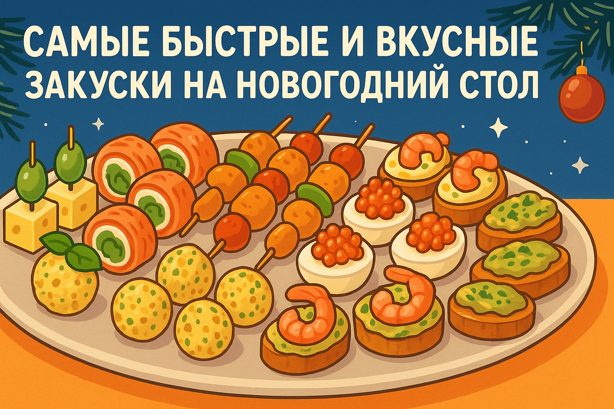 Новый год уже близко, а вы хотите удивить гостей вкусными и красивыми закусками, но не проводить часы на кухне? Эти 7 рецептов готовятся от 10 до 30 минут, легко украшаются и станут настоящим украшением праздничного стола. Легкая и яркая закуска, которая сочетает сладкий виноград и солоноватый сыр. Ингредиенты: Приготовление: Нежные рулетики с кремовым сыром и сочной красной рыбой — праздник вкуса в каждой порции. Ингредиенты: Приготовление: Яркая и сытная закуска, которую приятно держать в руке. Ингредиенты: Приготовление: Классическая праздничная закуска, яркая и нежная. Ингредиенты: Приготовление: Элегантная закуска с мягким авокадо и сочными креветками. Ингредиенты: Приготовление: Мягкие сырные шарики с хрустящими орехами — простая, но эффектная закуска. Ингредиенты: Приготовление: Нежные баклажаны с ароматным сыром и чесноком — необычная закуска, которая впечатляет гостей и отлично выглядит на столе. Ингредиенты: Пригот