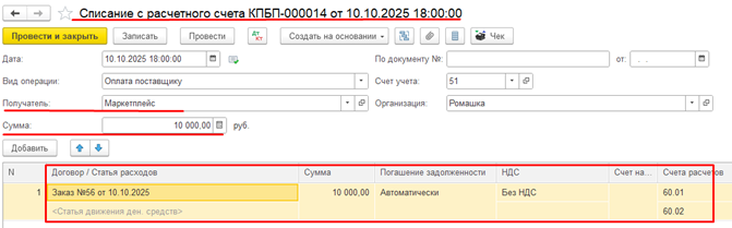 По договору, который маркетплейс заключает с Продавцом, «Права и обязанности по сделкам, связанным с реализацией товаров Продавца и заключенным от его имени, возникают непосредственно у Продавца (ст. 1005 ГК РФ)». Продавцом купленных товаров является фактический их владелец. Маркетплейс выступает агентом с поручением принимать денежные средства от покупателя и доставлять товары. Таким образом товар мы приобретаем через маркетплейс, оплачиваем маркетплейсу, получаем товар от него, но в УПД на товар в поле Продавец проставлены фактические продавцы товара (различные ООО, ИП). Оплата товаров оформляется документом Списание с расчетного счета (Банк и касса — Банковские выписки). В документе мы заполняем контрагента Маркетплейс, выбираем договор с ним и указываем сумму. При проведении документа формируются следующие проводки: Поступление товара оформляется документом Поступление товаров (накладная, УПД) (Покупки — Поступление (акты, накладные, УПД)). В документе мы указываем уже того кон