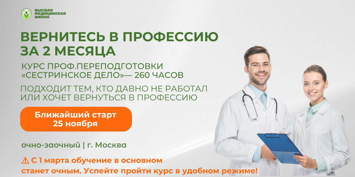 Курс профессиональной переподготовки «Сестринское дело» — 260 часов Курс подходит тем, кто давно не работал по специальности или хочет уверенно вернуться в профессию. ✔ Почему выбирают ВМШ Симуляционный центр Вы сможете безопасно отработать практические навыки на современных тренажёрах и фантомах, чтобы вернуться в профессию без страха и с полной уверенностью. Лицензия на образовательную деятельность — с 2012 года Высшая медицинская школа — стабильная образовательная организация с более чем 12-летним опытом. Мы не «однодневка», а центр обучения, которому доверяют медучреждения по всей России. 🗓 Ближайшие даты старта 🔴 25 ноября 2025 — 27 января 2026 🔴 10 декабря 2025 — 10 февраля 2026 🔴 23 декабря 2025 — 24 февраля 2026 Формат: очно-заочный | г. Москва ⚡ Важное изменение До 1 марта 2026 года можно пройти курс в максимально удобном режиме. После вступления закона в силу программы переподготовки будут преимущественно очными. 🎓 По итогам обучения вы получите диплом о профессиональной