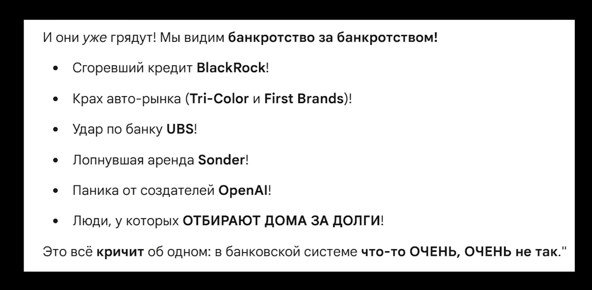 Все сыплется. Просят включить станок . % ставка должна упасть до минимума - это как бы правильно. Но если кредиторы не отдают деньги, то банки должны не давать кредиты в этот момент или только под большие % . Вот и получается качели. Но если это сделать сразу не решить это в тихую сейчас, то паника. Решить сразу и напечатать деньги - тогда падение всех активов и ..... крах .... Всеобщая Инфляция - пропасть В банках нет денег. А люди побегут снимать остальные. Кредиты дать не могут , так как в не стабильные времена нельзя раздавать кредиты. Т.е. когда мы не можем вернуть долги у нас все отнимают. А тут их должны поддержать все правительства в мире . . ПОСЛЕ ШОТДАУНа в 45 дней В США банки ОТБИРАЮТ ДОМА. Люди лишились дохода и после 3 раз не уплаты по 2 недели за раз люди не могут оплачивать дома их отбирают или продают их уже сейчас с молотка, просто оставляют банку. Но ведь нет реальных покупателей . Новый год- - все ждут и экономят. Еще один кризис для того, чтобы всех радеть до г