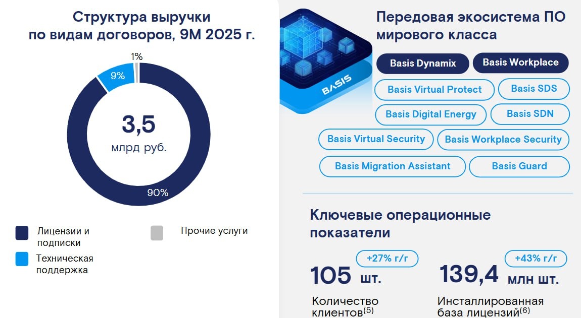 📊 Даже несмотря на непростую макроэкономическую ситуацию, где высокие ставки остужают инвестиционную активность и заставляют компании дважды думать перед внедрением новых технологий, «Базис» снова показывает, что стабильный рост возможен и в такие периоды. 📈 За 9 месяцев компания нарастила выручку до 3,5 млрд рублей (+57% г/г). Для рынка, который постепенно входит в более зрелую фазу, это впечатляющая скорость. Причём рост обеспечен не только «флагманами», но и стремительным развитием комплементарных решений — направление добавило кратный прирост, и их доля в выручке уже около 30%. Для экосистемной модели это важный критерий: клиентам нужен не один продукт, а комплекс решений. ✔️ OIBDA вышла на 1,9 млрд рублей (+42% г/г). Да, рентабельность немного снизилась, но здесь многое объясняется расширением штата, масштабированием и тем, что расходы идут равномерно, а большая часть выручки традиционно приходится ближе к концу года. С моей точки зрения, структура бизнеса остаётся вполне взвеше
